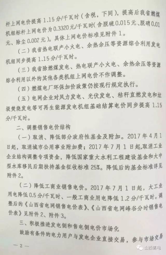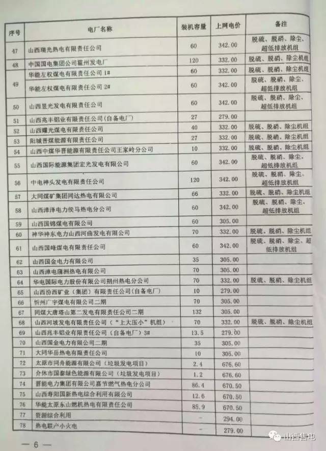 1.山西燃煤發(fā)電機(jī)組標(biāo)桿上網(wǎng)電價提高1.15分/千瓦時,提高后燃煤機(jī)組標(biāo)桿上網(wǎng)電價為0.332元/千瓦時。