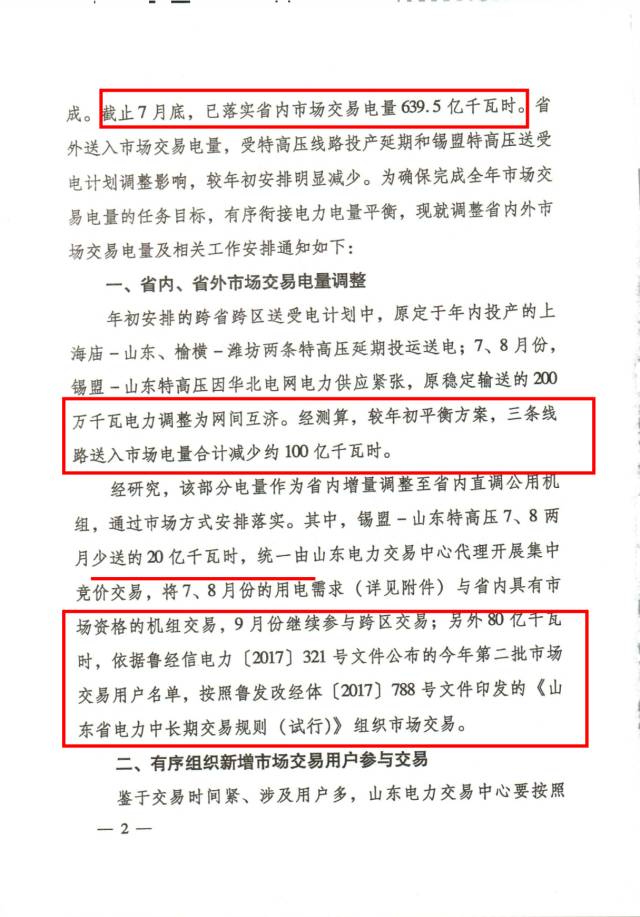 8月3日,山東省經(jīng)信委、山東物價局和國家能源局山東監(jiān)管辦公室聯(lián)合發(fā)布了《關(guān)于做好2017年省內(nèi)省外電力市場交易銜接調(diào)整工作的通知》。文件提到:截止7月底,山東省內(nèi)交易已經(jīng)落實市場交易電量639 5億千瓦時。10