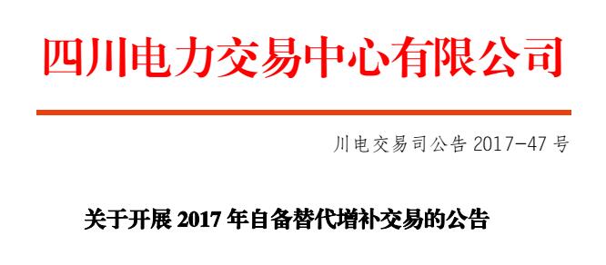 根據(jù)四川省經(jīng)濟和信息化委員會、四川省發(fā)展和改革委員會、國家能源局四川監(jiān)管辦公室、四川省能源局《關(guān)于印發(fā)四川省2017年直購電和富余電量政策實施方案的通知》(川經(jīng)信電力〔2017〕55號)、四川省經(jīng)濟和信息化委員會《關(guān)于印發(fā)2017年全省電力電量平衡方案及節(jié)能調(diào)度電力生產(chǎn)計劃的通知》(川經(jīng)信電力函〔2017〕62號)的要求,以及四川省2017年市場交易相關(guān)規(guī)則,決定于2017年8月24日開展2017年企業(yè)自備電廠停發(fā)替代增補交易,有關(guān)事項公告如下: