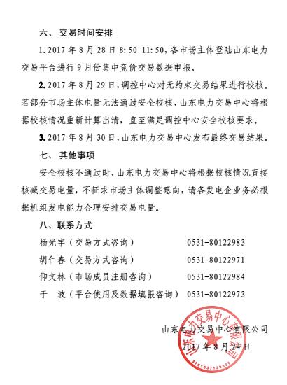 從山東電力交易中心獲悉,山東電力交易中心2日發(fā)布了關(guān)于2017年9月份電力直接交易(集中競價)公告。交易采取集中競價交易方式,2017年8月28日8:50-11:50,各市場主體登錄山東電力交易平臺進行9月份集中競價交易