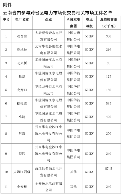 售電方:根據(jù)《南方區(qū)域跨區(qū)跨省月度電力交易規(guī)則(試行)》(廣州交易〔2017〕65號(hào),以下簡(jiǎn)稱交易規(guī)則)并結(jié)合云南政府相關(guān)部門(mén)意見(jiàn),初期為云南14家水電廠,具體名單見(jiàn)附件。