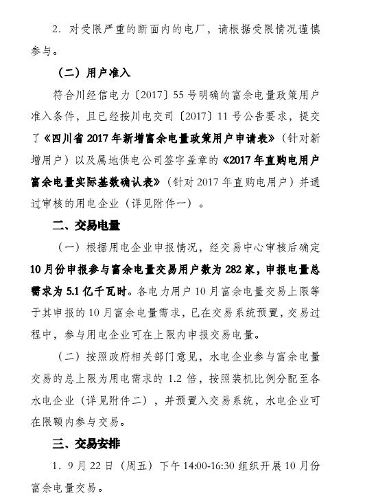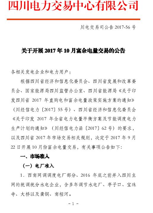 2017年9月21日四川電力交易中心發(fā)布《關于開展2017年10月富余電量交易的公告》。9月22日(周五)下午14:00-16:30組織開展10月份富余電量交易。根據(jù)用電企業(yè)申報情況,經(jīng)交易中心審核后確定10月份申報參與富余電量