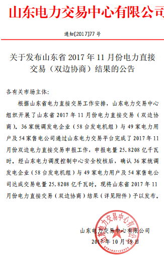 10月19日,山東電力交易中心發(fā)布了關(guān)于2017年11月份電力直接交易(雙邊協(xié)商)結(jié)果的公告,36家統(tǒng)調(diào)發(fā)電企業(yè)(58臺(tái)發(fā)電機(jī)組)與49家電力用戶及54家售電公司通過山東電力交易平臺(tái)完成了2017年11月雙邊電力直接交易申報(bào)