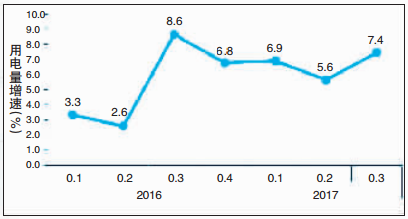 前三季度,國家電網(wǎng)經(jīng)營區(qū)全社會用電量約3.73億千瓦時,同比增長6.7%,增速同比上升1.7個百分點,增速創(chuàng)2014年以來同期新高。分季度看,2017年一、二、三季度增速分別為6.9%、5.6%、7.4%,一、二季度增速同比分別上升3.6、3.1個百分點,三季度增速同比下降1.2個百分點。據(jù)測算,今年6~8月的降溫電量接近2200億千瓦時,增幅接近29%。若剔除高溫因素,前三季度用電量同比增長5.6%,增速仍高出去年同期1.8個百分點,顯示我國經(jīng)濟(jì)繼續(xù)保持穩(wěn)中向好的發(fā)展態(tài)勢,前三季度GDP增速為6.9%,比上年同期提高了0.2個百分點。