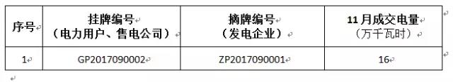 貴州關于2017年11月掛牌交易(電力用戶、售電公司掛牌)成交情況的公告:成交電量16萬千瓦時