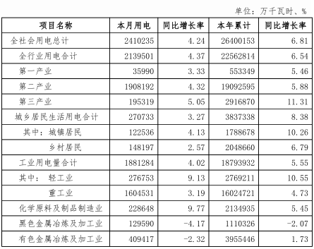 (一)分行業(yè)用電量情況。10月份,第一產業(yè)完成用電量3.6億千瓦時,同比增長3.33%;第二產業(yè)完成用電量190.82億千瓦時,同比增長4.32%;第三產業(yè)完成用電量19.53億千瓦時,同比增長5.05%;全省城鄉(xiāng)居民生活用電27.07億千瓦時,同比增長3.27%。工業(yè)用電量188.13億千瓦時,同比增長4.02%,其中,輕工業(yè)用電量27.67億千瓦時,同比增長9.13%,重工業(yè)用電量160.45億千瓦時,同比增長3.19%。10月份,有色金屬行業(yè)用電量40.94億千瓦時,同比減少2.32%。黑色金屬行業(yè)用電量12.96億千瓦時,同比減少4.17%?;瘜W原料及制品制造行業(yè)用電量22.86億千瓦時,同比增長9.77%。