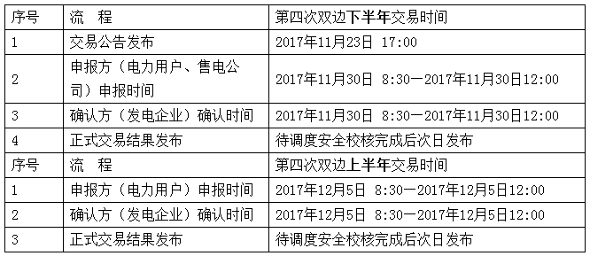 第四次雙邊下半年交易時間:申報方(電力用戶、售電公司)申報時間 2017年11月30日8:30分至2017年11月30日12:00。