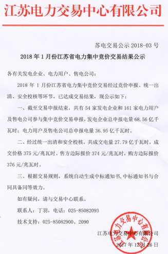 江蘇2018年1月集中競(jìng)價(jià)交易成交電量27.79億千瓦時(shí)