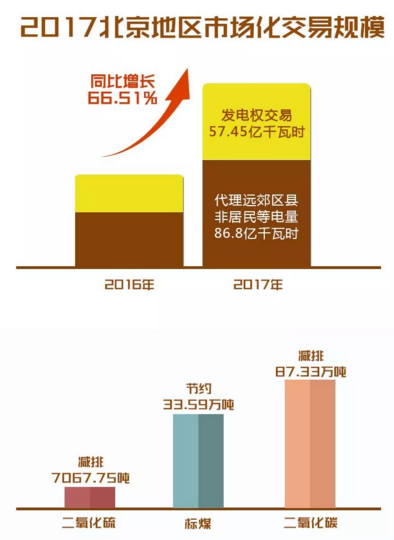 2017年,北京地區(qū)全年完成市場(chǎng)化交易電量144 25億千瓦時(shí),同比增長(zhǎng)66 51%,其中,發(fā)電權(quán)交易電量57 45億千瓦時(shí),節(jié)約標(biāo)煤33 59萬(wàn)噸、減排二