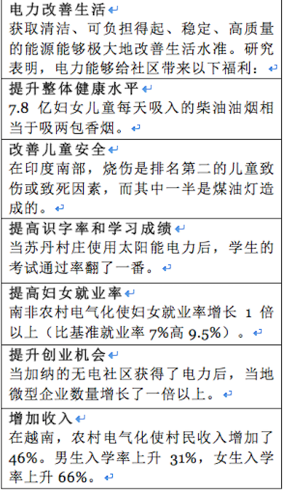 少量的電力都能對(duì)人民生活和經(jīng)濟(jì)發(fā)展產(chǎn)生巨大影響,”參與SEED項(xiàng)目的落基山研究所董事Eric Wanless如是說(shuō)。有了電力,孩子們就能夠在晚上繼續(xù)學(xué)習(xí);企業(yè)能夠在天黑后繼續(xù)運(yùn)行,這能夠?yàn)槠髽I(yè)帶來(lái)更多經(jīng)濟(jì)機(jī)會(huì),員工也能夠在工作一天后有時(shí)間去購(gòu)買日常用品;面粉廠等在電力的驅(qū)動(dòng)下能夠以更快速度和更低成本提供更有效率的服務(wù)。