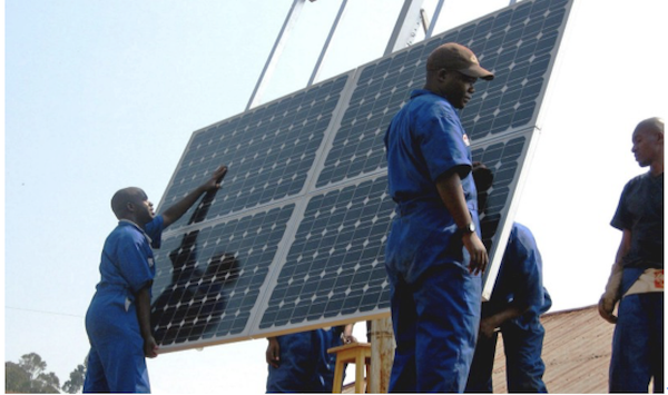 工人在盧旺達(dá)診所學(xué)習(xí)安裝太陽(yáng)能板,那里只有24%的人口能夠用電。