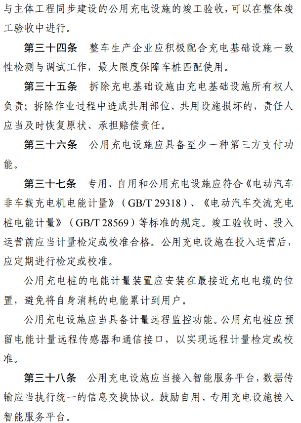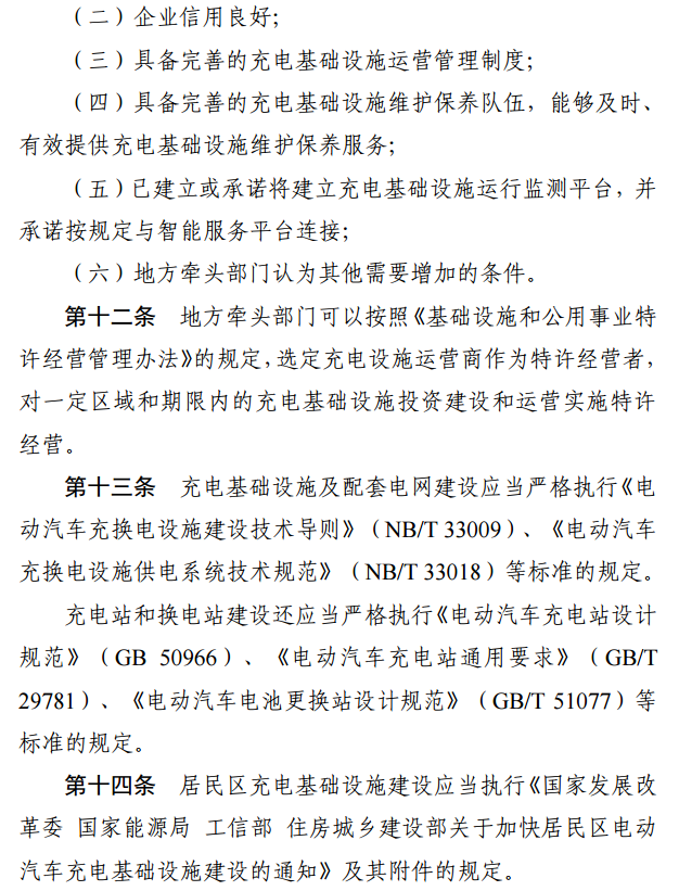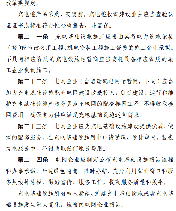 電動汽車生產(chǎn)銷售企業(yè)應(yīng)當(dāng)將充電設(shè)施建設(shè)維護(hù)納入其銷售服務(wù)體系,委托充電設(shè)施施工企業(yè)提供施工服務(wù)或委托充電設(shè)施運營商提供綜合性服務(wù)。與私人用戶簽訂銷售車輛合同之前,應(yīng)當(dāng)告知用戶提供的充電樁產(chǎn)品參數(shù)、價格、產(chǎn)品責(zé)任保險、建設(shè)維護(hù)服務(wù)內(nèi)容、服務(wù)收費標(biāo)準(zhǔn)等基本信息。用戶可選擇接受電動汽車生產(chǎn)銷售企業(yè)提供的產(chǎn)品和服務(wù),也可另行委托充電設(shè)施運營商提供綜合性服務(wù)。