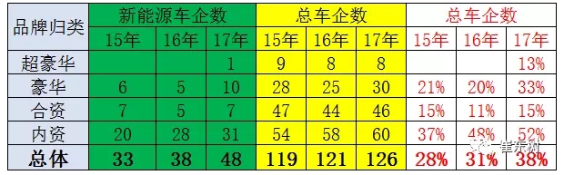 上表是按照品牌銷售的廠家口徑的數(shù)量,與合格證的廠家生產(chǎn)法人的口徑相對(duì)簡(jiǎn)化,但權(quán)威的仍是法人單位的統(tǒng)計(jì)角度。對(duì)18年實(shí)施雙積分的最初的預(yù)期是企業(yè)能迅速推動(dòng)插電混動(dòng)和純電動(dòng)的均衡發(fā)展,合資企業(yè)能夠推出新能源車。世界新能源車的隨著油價(jià)下跌的需求不旺,發(fā)展新能源車的熱情不高,新品推出不強(qiáng)。而合資企業(yè)的新能源車缺乏研發(fā)能力,外方導(dǎo)入需要一定時(shí)間,進(jìn)度相對(duì)較慢。因此17年的合資企業(yè)推出新能源車的有7家占比15%,內(nèi)資企業(yè)推出新能源車的有31家,占52%。