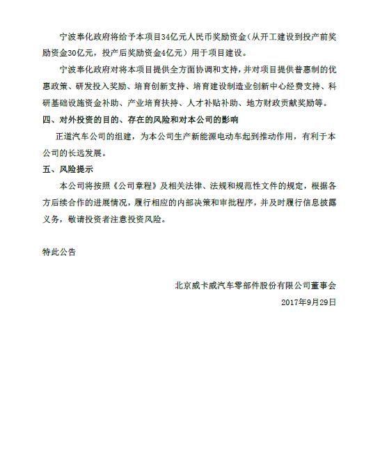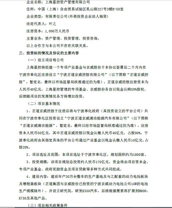 9月29日,北京威卡威汽車零部件股份有限公司(簡稱“京威股份”)官方網(wǎng)站發(fā)布公告稱,公司于2017年9月27日召開第四屆董事會第十四次會議,審議通過了《關(guān)于對外投資并簽署相關(guān)協(xié)議的議案》,并與寧波市奉化區(qū)人民政府、正道集團有限公司(香港)在大陸境內(nèi)的全資子公司上海星控資產(chǎn)管理有限公司(簡稱“上海星控”)共同簽訂了《投資協(xié)議》,將在寧波市奉化區(qū)投資建設(shè)一個年產(chǎn)30萬臺的清潔能源整車生產(chǎn)基地,該項目規(guī)劃總投資約人民幣170億元,規(guī)劃用地約1800畝。