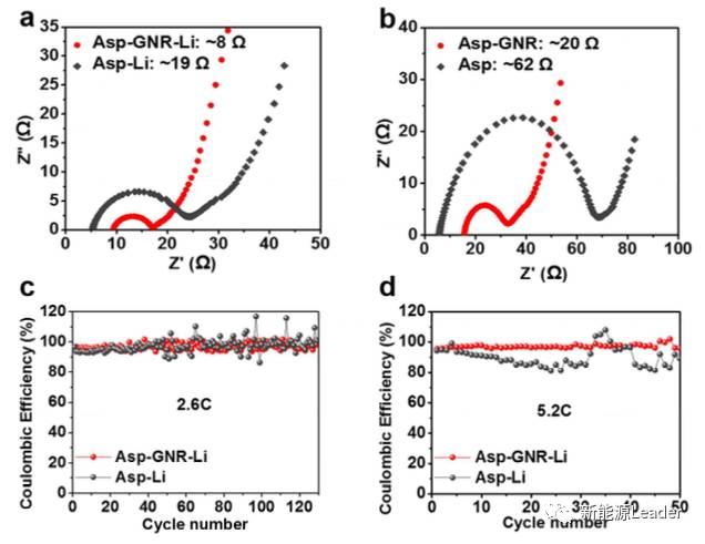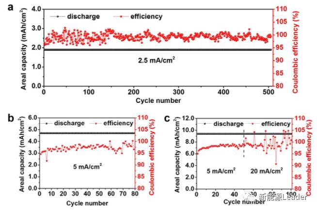 通過提高Li的負(fù)載量可以有效的提高負(fù)極的面容量密度,下圖a為L(zhǎng)i:C=1:5,比容量為643mAh/g,圖b為1:2,比容量為1287mAh/g,圖c為1:1,比容量為1930mAh/g,從圖上可以看到提高Li負(fù)載量后,多孔碳Asp-GNRs材料仍然保持了很高的庫(kù)倫效率和循環(huán)性能。