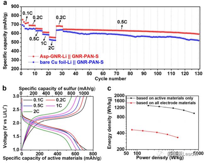 下圖為TuoWang利用Asp-GNRs材料作為負(fù)極,硫碳混合物(S-C)材料作為正極制備的全電池的測(cè)試數(shù)據(jù)。從圖a中我們可以看到,在0.1,0.2,0.5,1和2C倍率下,材料的比容量分別達(dá)到720,690,655,613和559mAh/g,表現(xiàn)出了非常好的倍率性能。在0.5C的倍率下循環(huán)100次容量保持旅可達(dá)92%,遠(yuǎn)高于使用裸露銅箔負(fù)極的對(duì)照組。全電池的功率密度可達(dá)1322W/kg,能量密度可達(dá)943Wh/kg。