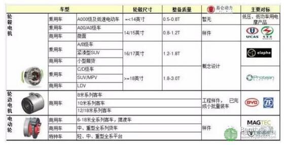 輪轂電機(jī)在客車中應(yīng)用就比較多了,如BYD、宇通、中通、蘇州金龍等;湖北泰特機(jī)電有限公司、易輪動(dòng)力等等也都在積極布局中。
