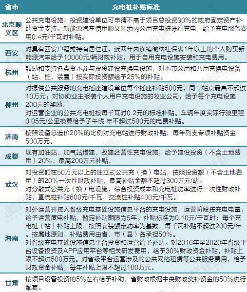 圖表2:各省市電動(dòng)汽車充電樁補(bǔ)貼匯總