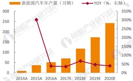 根據(jù)國(guó)務(wù)院發(fā)布的《“十三五”國(guó)家戰(zhàn)略性新興產(chǎn)業(yè)發(fā)展規(guī)劃》,到2020年,新能源汽車實(shí)現(xiàn)當(dāng)年產(chǎn)銷200萬(wàn)輛以上,累計(jì)產(chǎn)銷超過(guò)500萬(wàn)輛,CAGR達(dá)到41%,市場(chǎng)前景廣闊。根據(jù)相關(guān)數(shù)據(jù)測(cè)算,預(yù)計(jì)2020年我國(guó)新能源汽車產(chǎn)量將達(dá)到242萬(wàn)輛,CAGR達(dá)到46.88%。其中,乘用車是主力車型,銷量將突破200萬(wàn)輛。