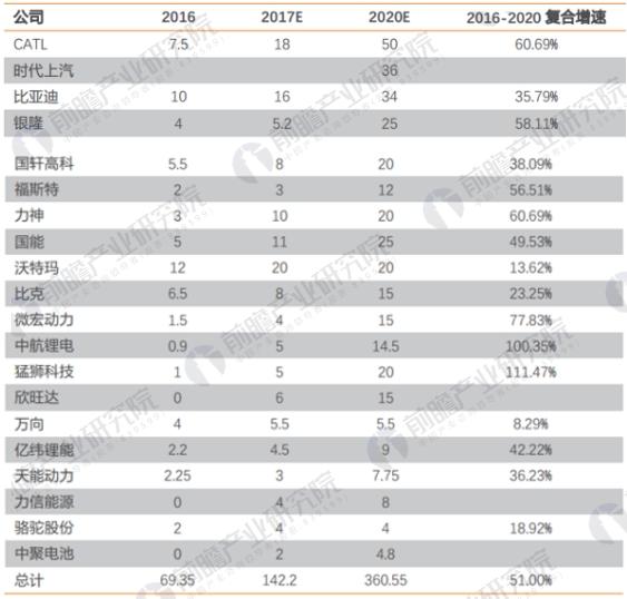受益新能源汽車發(fā)展,鋰電企業(yè)資本開(kāi)支迎來(lái)爆發(fā)增長(zhǎng)。為了在新的市場(chǎng)和政策環(huán)境下提高自身企業(yè)的競(jìng)爭(zhēng)力,2017年,多家廠家宣布擴(kuò)產(chǎn)計(jì)劃。根據(jù)前瞻產(chǎn)業(yè)研究院發(fā)布的《動(dòng)力鋰電池行業(yè)投資分析報(bào)告》統(tǒng)計(jì),2016年,主要?jiǎng)恿︿囯姵貜S商合計(jì)產(chǎn)能為69.35Gwh,2017年有望達(dá)到142.2Gwh,到2020年將有望升至360.55Gwh,期間增速高達(dá)51%。