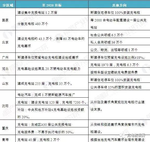 在國(guó)家政策和各省市新能源汽車(chē)產(chǎn)銷(xiāo)量的影響下,國(guó)內(nèi)代表性地區(qū)紛紛制定出到2020年省市充電樁的建設(shè)目標(biāo),從國(guó)家層面至2020年集中建設(shè)交換電樁1.2萬(wàn)座,布局于公共場(chǎng)所等的分散充電樁480萬(wàn)個(gè),其他省市均從電動(dòng)汽車(chē)的推廣、充電樁的建設(shè)和充電服務(wù)費(fèi)角度規(guī)劃充電樁的建設(shè)布局。