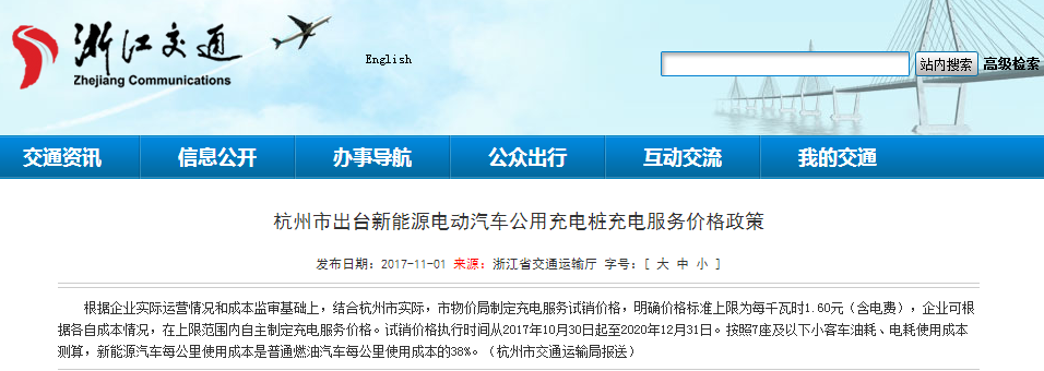 11月1日,浙江省交通運(yùn)輸廳正式發(fā)布了《杭州市出臺(tái)新能源電動(dòng)汽車(chē)公用充電樁充電服務(wù)價(jià)格政策》,對(duì)杭州市新能源汽車(chē)公共充電樁價(jià)格進(jìn)行了規(guī)定。政策表明,根據(jù)企業(yè)實(shí)際運(yùn)營(yíng)情況和成本監(jiān)審基礎(chǔ)上,結(jié)合杭州市實(shí)際,市物價(jià)局制定充電服務(wù)試銷(xiāo)價(jià)格,明確價(jià)格標(biāo)準(zhǔn)上限為每千瓦時(shí)1.60元(含電費(fèi)),企業(yè)可根據(jù)各自成本情況,在上限范圍內(nèi)自主制定充電服務(wù)價(jià)格。試銷(xiāo)價(jià)格執(zhí)行時(shí)間從2017年10月30日起至2020年12月31日。按照7座及以下小客車(chē)油耗、電耗使用成本測(cè)算,新能源汽車(chē)每公里使用成本是普通燃油汽車(chē)每公里使用成本的38%。