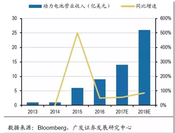 對比往年數(shù)據(jù),今年LG化學(xué)動力電池出貨量及營業(yè)收入穩(wěn)中有升。有研究機(jī)構(gòu)預(yù)測,其在2018年將迎來較大增長,且看下圖: