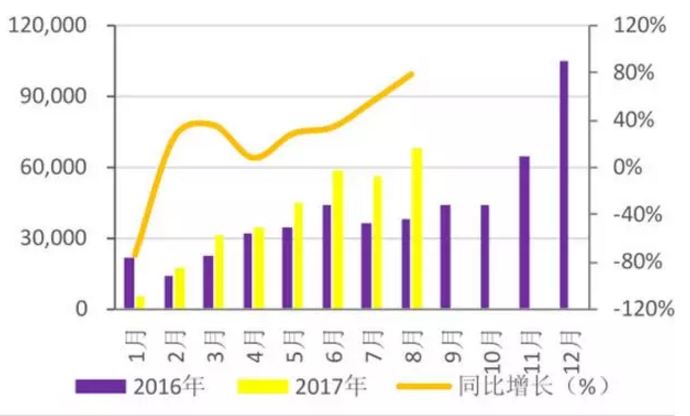 2016/2017年各月新能源汽車(chē)銷(xiāo)量(輛)