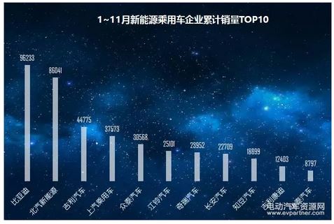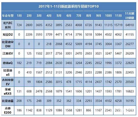 從車企表現(xiàn)看,2017年1~11月,比亞迪以9.6萬(wàn)臺(tái)的累計(jì)銷量位居冠軍,北汽新能源憑借EC180的銷量排在第二位;吉利汽車排在了第三位,累計(jì)銷售4.5萬(wàn)臺(tái)。值得注意的是,北汽新能源11月新能源乘用車銷量為1.9萬(wàn)臺(tái),預(yù)計(jì)12月銷量將突破2萬(wàn)臺(tái),全年銷量有望突破10萬(wàn)臺(tái)。從全年累計(jì)銷量來(lái)看,電動(dòng)汽車資源網(wǎng)認(rèn)為比亞迪和北汽新能源都將有奪得冠軍寶座的可能,比亞迪的勝算應(yīng)該會(huì)更大一些。