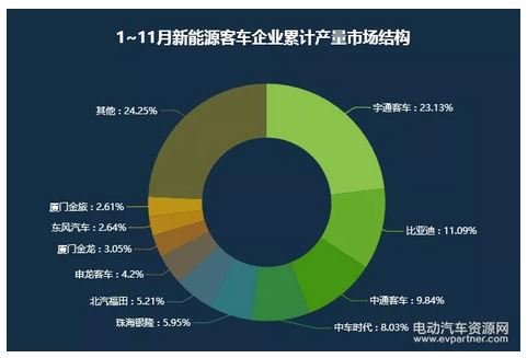 從1-11月累計(jì)產(chǎn)量看,宇通客車?yán)^續(xù)保持優(yōu)勢(shì)地位,是目前唯一一個(gè)累計(jì)產(chǎn)量過(guò)萬(wàn)的企業(yè),占比也提升到了23.13%。此外1~11月新能源客車?yán)塾?jì)產(chǎn)量超過(guò)五千臺(tái)的還有比亞迪和中通客車,分別為5806臺(tái)和5153臺(tái)。