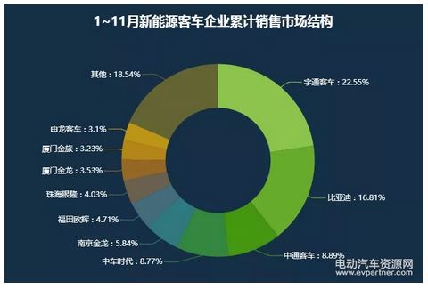 企業(yè)表現(xiàn)來(lái)看,2017年1~11月,宇通客車和比亞迪兩家前11月的累計(jì)銷量都超過(guò)了1萬(wàn)臺(tái),占比分別為22.55%和16.81%;中通客車與中車時(shí)代為第二梯隊(duì),銷量在6千臺(tái)以上,占比分別為8.89%和8.77%;南京金龍、福田歐輝、珠海銀隆、廈門金龍等為第三梯隊(duì),銷量均在5千臺(tái)以下。