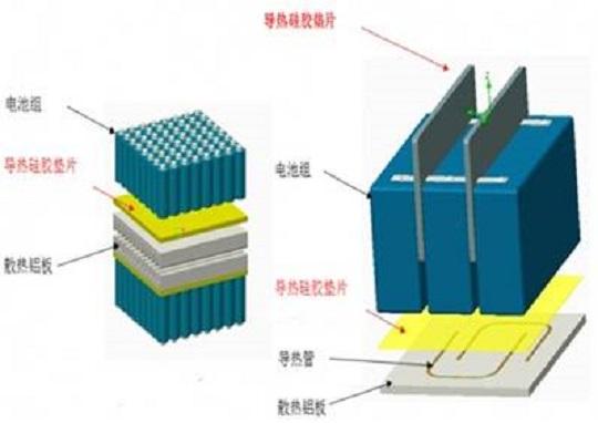 1、此類電池組空間大,與空氣接觸良好,裸露部分能通過空氣自然換熱,底部不能自然換熱部位通過散熱器散熱,導熱硅膠片填充散熱器與電池組中間空隙,導熱、減震、絕緣。