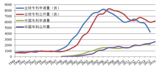 圖中揭示的是國際和國內(nèi)專利的年度分布情況??紤]到專利一般從申請到公開需要長達(dá)1年甚至3年的時間,因此專利年度申請數(shù)量在2015年(包括)以后出現(xiàn)失真。2015-2016年專利分布情況可以參考年度專利公開數(shù)量。