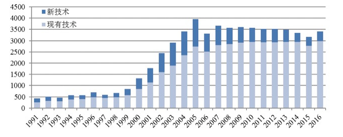 圖中將IPC分類號數(shù)量近似算作技術(shù)的數(shù)量,深藍(lán)色表示當(dāng)年新出現(xiàn)的技術(shù),淺藍(lán)色表示當(dāng)年之前已經(jīng)存在的技術(shù)。圖中顯示,燃料電池技術(shù)在1999年前后,新技術(shù)和已有技術(shù)同步快速增長,發(fā)展到2006年,隨著年度技術(shù)數(shù)量基本保持平穩(wěn),新技術(shù)的比例呈現(xiàn)下降趨勢,反映出行業(yè)技術(shù)趨于成熟。