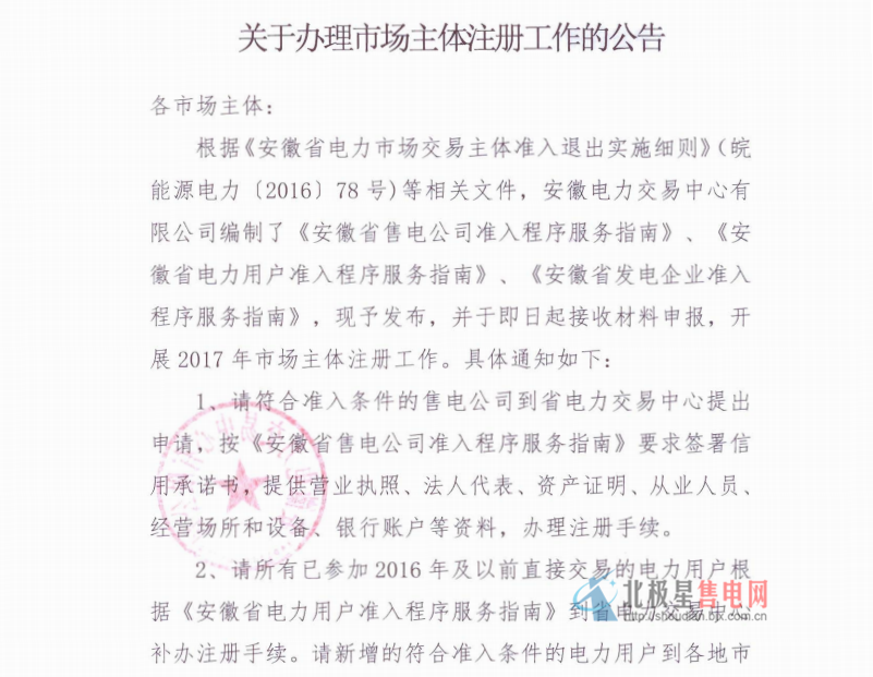 安徽發(fā)布辦理市場主體注冊工作公告(附售電公司準(zhǔn)入程序服務(wù)指南)