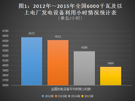 如圖1所示,全國6000千瓦及以上電廠發(fā)電設(shè)備累計平均利用小時數(shù)逐年降低,2012年為4572小時,2013年為4511小時,2014年為4286小時,2015年為3969小時,其中2014年和2015年均連續(xù)破1978年以來的最低水平。