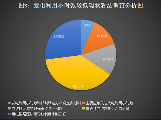 如圖3所示,超過1/3的受訪者(38.50%)認為需要適當控制電力發(fā)展速度;27.05%的受訪者認為用電量增速放緩導致利用小時數(shù)低;14.50%的受訪者表示應該以發(fā)展的眼光看待這一問題;13.65%的受訪者表示主要應該關(guān)注火電利用小時數(shù);還有6.30%的受訪者則認為發(fā)電利用小時數(shù)難以判斷電力產(chǎn)能是否過剩。
