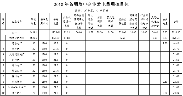山西經(jīng)信委:2018年度省調(diào)發(fā)電企業(yè)發(fā)電量調(diào)控目標(biāo)預(yù)案