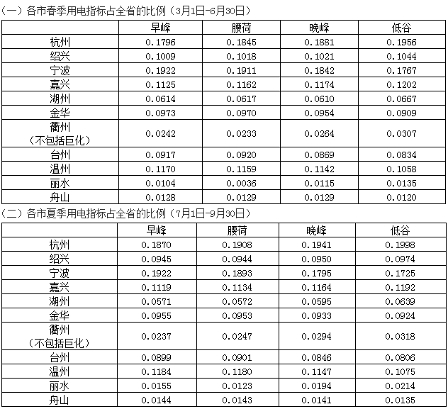 浙江省2018年春、夏、秋季用電指標(biāo)