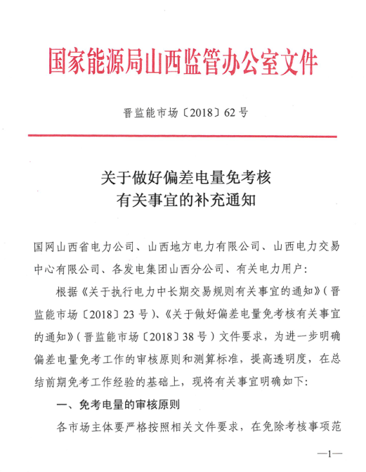 國(guó)家能源局山西監(jiān)管辦日前發(fā)布了《關(guān)于做好偏差電量免考核有關(guān)事宜的補(bǔ)充通知》,通知中對(duì)免考電量的審核原則進(jìn)行了公布,五種情況不予免除,同時(shí)規(guī)定了免考電量的測(cè)算標(biāo)準(zhǔn)。詳情如下: