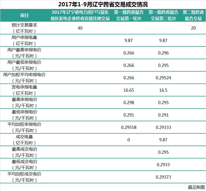 2017年遼寧省電力用戶與蒙東地區(qū)發(fā)電企業(yè)跨省直接掛牌交易1~9月份一共有兩批。根據(jù)北京交易中心發(fā)布的交易通知,第一批跨省交易的預(yù)計需求電量為40億千瓦時,第二批跨省交易的預(yù)計需求電量為20億千瓦時。然而在第一批第一輪的交易中,用戶申報的需求電量是9.87億千瓦時,但是最終是0成交。第二輪用戶申報的9.87億千瓦時電量全部成交,成交均價為0.29373元/千瓦時。也就是說,遼寧電力用戶與蒙東地區(qū)發(fā)電企業(yè)跨省直接交易的第一批只成交了9.87億千瓦時,結(jié)果并沒有預(yù)計中的多。