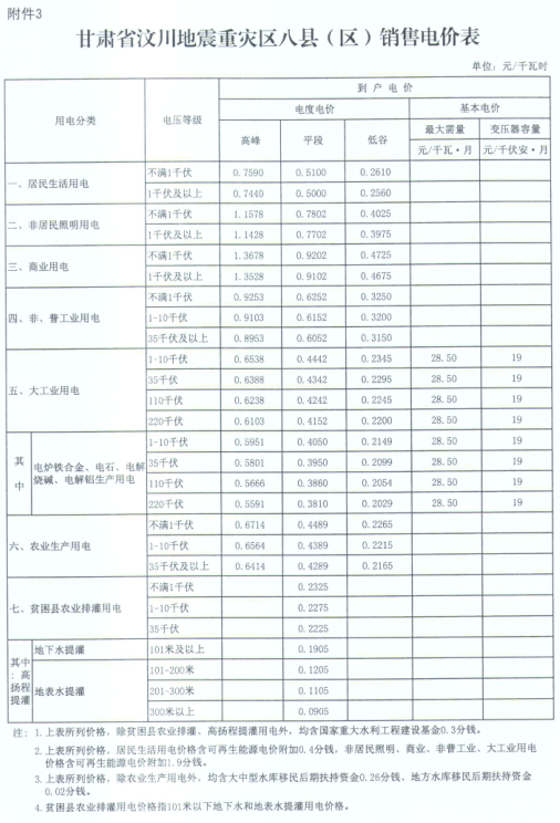 3.甘肅省汶川地震重災(zāi)區(qū)八縣(區(qū))銷售電價(jià)表