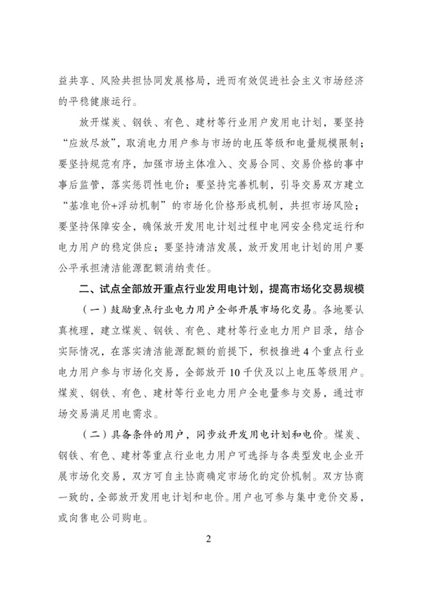 (一)在確保電網(wǎng)安全、妥善處理交叉補貼和公平承擔清潔能源配額的前提下,有序放開用戶電壓等級及用電量限制,符合條件的10千伏及以上電壓等級用戶均可參與交易。支持年用電量超過500萬千瓦時以上的用戶與發(fā)電企業(yè)開展電力直接交易。2018年放開煤炭、鋼鐵、有色、建材等4個行業(yè)電力用戶發(fā)用電計劃,全電量參與交易,并承擔清潔能源配額。