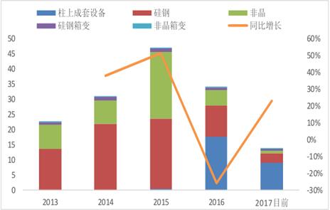 隨著配電網(wǎng)投資的興起,配電設(shè)備以及相關(guān)電力工程勘察設(shè)計(jì)行業(yè)在“十三五”期間將保持高速增長。其中,配電變壓器是配電網(wǎng)的核心設(shè)備之一,在2015年國網(wǎng)招標(biāo)規(guī)模迎來高峰,達(dá)到47萬臺。2016年,由于國網(wǎng)人事調(diào)整等原因,變壓器招標(biāo)規(guī)模下降到35萬臺以下,但從2017年第一批配電網(wǎng)招標(biāo)來看,規(guī)模較去年同比上升約23%,行業(yè)出現(xiàn)了顯著回暖跡象,預(yù)計(jì)未來幾年有望保持穩(wěn)定增長,尤其是農(nóng)網(wǎng)領(lǐng)域的改造升級。