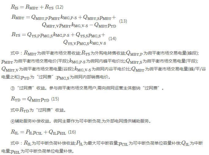 ②內(nèi)部售電收益。分為微平衡市場(chǎng)交易收益和外購(gòu)電轉(zhuǎn)售收益兩部分。分布式能源通過(guò)微平衡市場(chǎng)交易,實(shí)現(xiàn)就近消納,售電價(jià)格為微平衡市場(chǎng)交易價(jià)格。微網(wǎng)運(yùn)營(yíng)主體將外部電力市場(chǎng)購(gòu)買電量轉(zhuǎn)售給微網(wǎng)用戶,售電價(jià)格為雙方自主協(xié)商價(jià)格。同時(shí)微網(wǎng)運(yùn)營(yíng)主體在微網(wǎng)內(nèi)部自主確定峰/谷/平電價(jià)比等電價(jià)參數(shù),開展精細(xì)化需求側(cè)響應(yīng)。