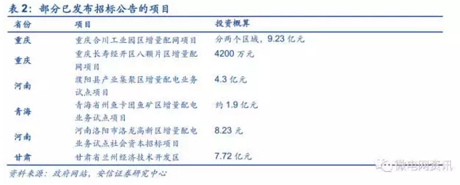 3)7月20日,國家發(fā)改委、國家能源局印發(fā)《關于請報送第二批增量配電業(yè)務改革試點項目的通知》,要求各地報送3-5個第二批增量配電項目,并要求第一批試點項目應于9月底之前完成項目業(yè)主確定。