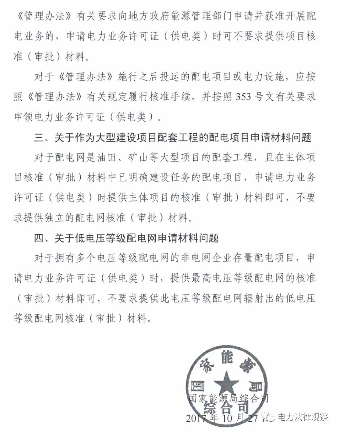 在主體項(xiàng)目核準(zhǔn)(審批)材料中已明確建設(shè)任務(wù)的配電項(xiàng)目,其作為油田、礦山等大型項(xiàng)目的配套工程,在申請(qǐng)電力業(yè)務(wù)許可證(供電類)時(shí),不需要提供獨(dú)立的配電網(wǎng)核準(zhǔn)(審批)材料,只提供明確了配電項(xiàng)目建設(shè)任務(wù)的油田、礦山等主體項(xiàng)目的核準(zhǔn)(審批)材料即可。觀茶君覺得,這可能是這個(gè)復(fù)函中最實(shí)用的一條,對(duì)于油田、礦山等擁有存量配電設(shè)施的企業(yè)而言無疑是大大利好!!!