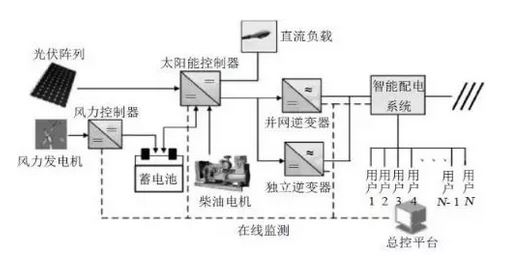 智能微網(wǎng)系統(tǒng)采用多種新型能源供電,是新型電力電子技術(shù)、分布式發(fā)電、可再生能源發(fā)電技術(shù)和儲(chǔ)能技術(shù)的綜合,集成多個(gè)分布式發(fā)電單元和負(fù)荷作為一個(gè)單獨(dú)的電網(wǎng)系統(tǒng),可獨(dú)立向負(fù)載供電或與市電配合向負(fù)載供電。