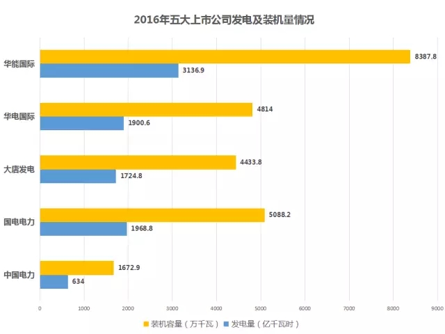 2、華能國際、華電國際和中國電力發(fā)電量較2015年增加,大唐發(fā)電和國電電力發(fā)電量減少。