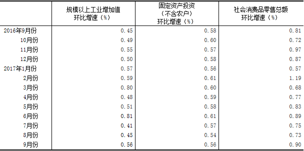 (2)根據(jù)季節(jié)調(diào)整模型自動修正結(jié)果,對近一年來各期國內(nèi)生產(chǎn)總值、規(guī)模以上工業(yè)增加值、固定資產(chǎn)投資(不含農(nóng)戶)、社會消費品零售總額環(huán)比增速進行修訂。修訂結(jié)果及2017年三季度GDP環(huán)比數(shù)據(jù)、2017年9月份其他指標(biāo)環(huán)比數(shù)據(jù)如下: